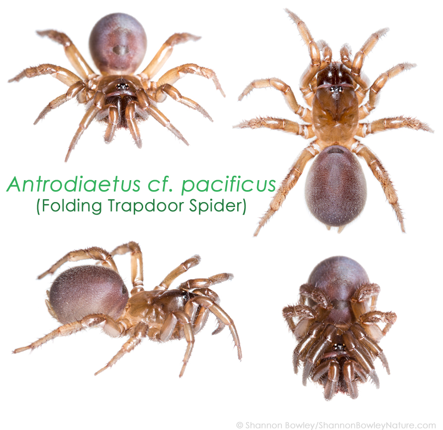 Several days ago, James found an immature Antrodiaetus (a mygalomorph, similar to a tarantula with fangs that plunge parallel and downwards into prey. They are different from the true spiders (Araneomorphs) such as orb weavers, jumping spiders and wolf spiders, for example, as true spiders have fangs and mandibles that operate in a pinching movement. There are some other differences though!) There are around 21 species, and I know of three that live in Washington State – Antrodiaetus pacificus, which is what I suspect this immature female to be, only based on Arachnologist Rod Crawford’s ID of the last Antrodiaetus we found here on the property (could be another one, I wouldn’t be surprised that more than one species lives here, but again, I’m speculating!) Antrodiaetus pugnax, which I believe is what Rod identified my Renton, WA specimens as, and A. occultus, one I’d found for him during a collecting trip several years ago, near Mt. Rainier. I’ll have to do some research about the diversity within Washington State later, and update this post.